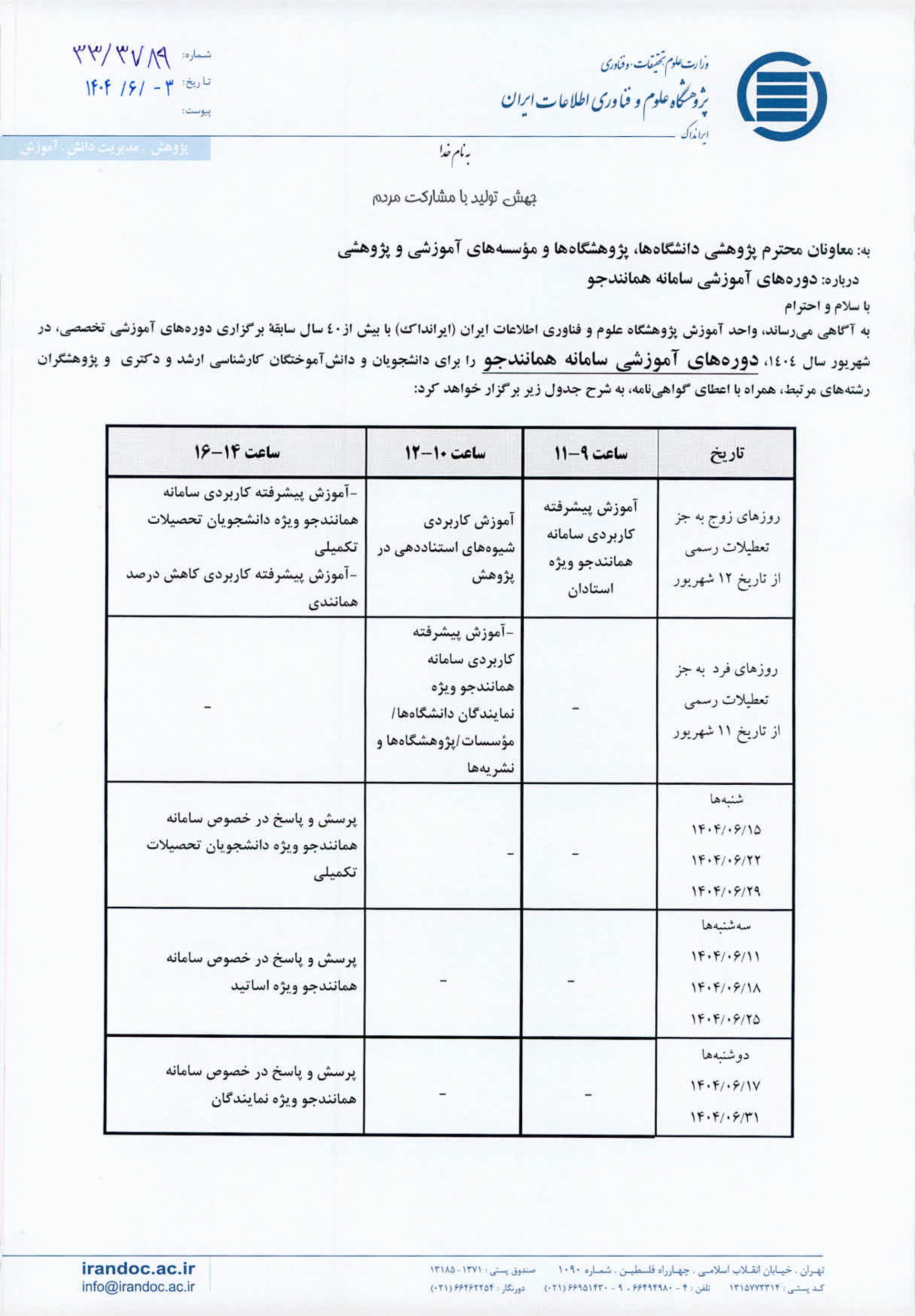 به  اطلاع علاقمندان می‌رساند، واحد آموزش پژوهشگاه علوم و فناوری اطلاعات ایران (ایرانداک) با بیش از ۴۰ سال سابقه برگزاری دوره‌های آموزشی تخصصی، دوره‌های آموزشی سامانه همانندجو را برای اساتید، دانشجویان و دانش‌آموختگان کارشناسی ارشد و دکتری و پژوهشگران رشته‌های مرتبط، همراه با اعطای گواهی نامه، در شهریور 1404 و به شرح جدول زیر برگزار خواهد کرد.